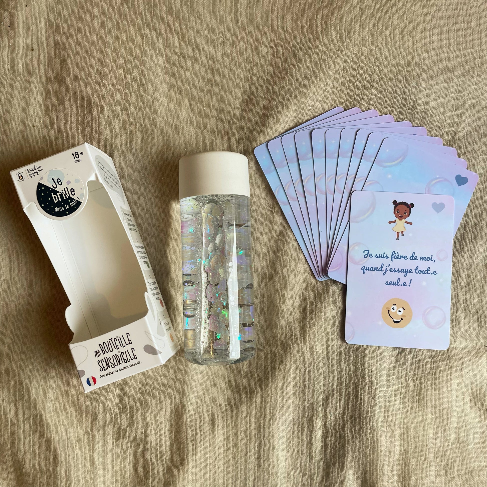 Avec sa bouteille sensorielle phosphorescente fabriquée en France par L'Atelier Gigogne , la magie opère dès les premières secondes : les paillettes scintillantes, la lumière danse, et le calme s'installe doucement ⭐